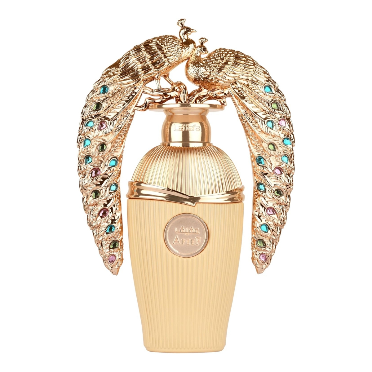 - Design do Frasco: O frasco é um destaque, com design robusto, detalhes em dourado e a imagem de um pavão, simbolizando elegância e luxo.